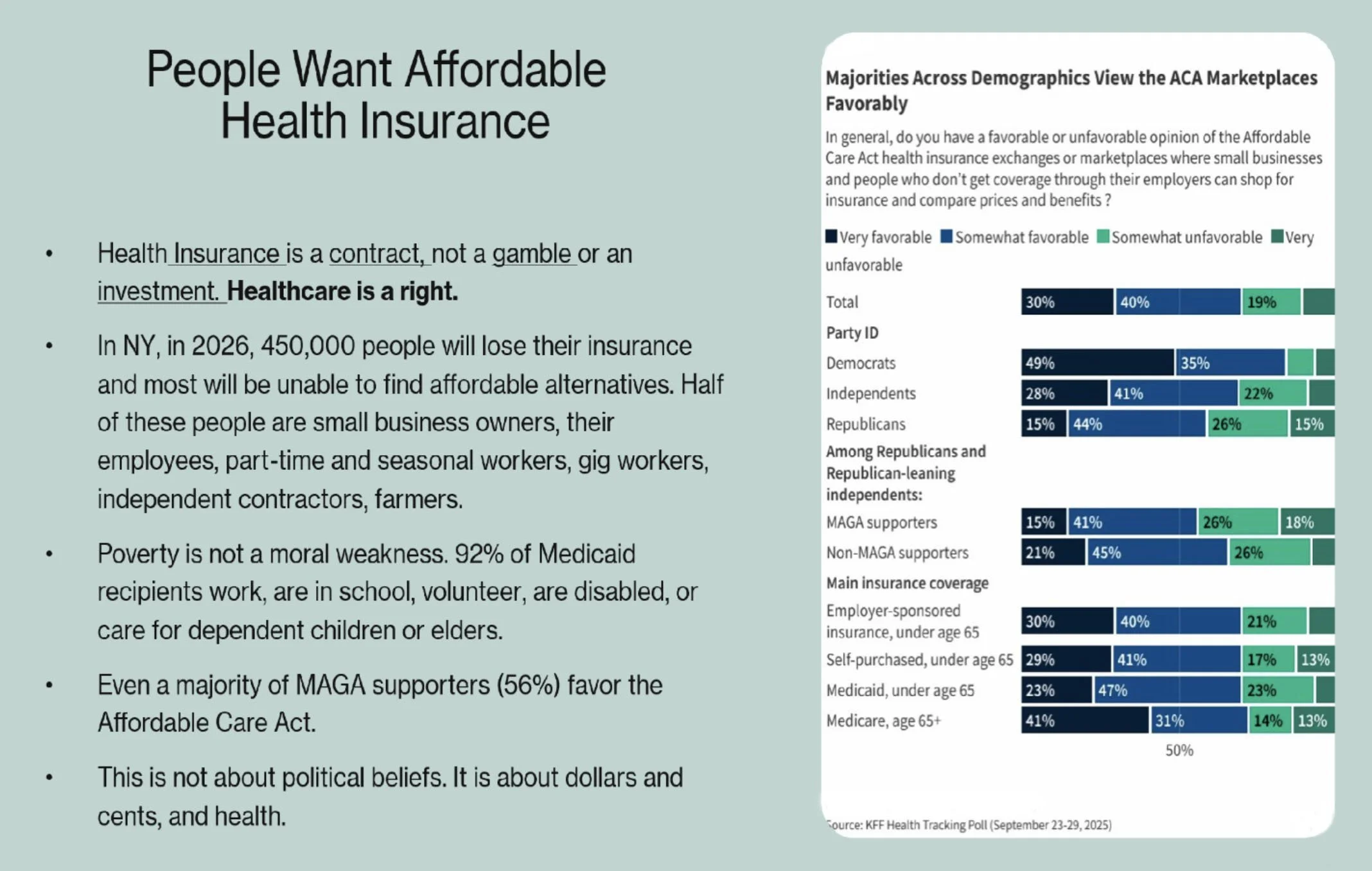 As noted on our “Facts” page there are many different names for Medicaid and Affordable Care Act programs in New York State: Medicaid, ACA/Affordable Care Act , the Marketplace, Qualified Health Plans, the Essential Plan, , Obamacare, CHIP/Child Health Insurance Plan, WIC/Women and Infants Care, Dual-eligible Medicare&Medicaid. Many participants don’t realize that all of these will be affected by the cuts to Medicaid. Many others will lose tax credits that made health insurance affordable for them.